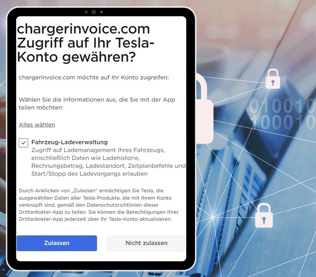 The access data for the chargerinvoice.com portal is stored in encrypted form. Access to Tesla is obtained via API. This requires a token that must be renewed every few hours. During the authorization process with Tesla, no Tesla access data is ever stored on the chargerinvoice.com site, only the resulting token.